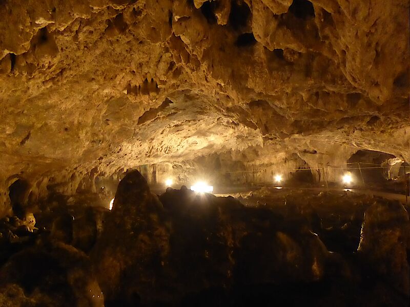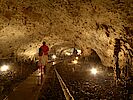Weiter ging es zu einer Tropfsteinhöhle. Wir haben es gerade noch geschafft die 18 Uhr Führung zu erwischen. Von insgesamt 8 Kilometer sind zwar gerade einmal 800 Meter öffentlich, aber die haben es in sich. Wie immer starten wir hervorragend ausgerüstet zur Höhlenbesichtigung (kein festes Schuhwerk, kurze Hose, keine Jacke, keine Lampe,...) und mussten dann erstaunt feststellen, dass diese in keinster Weise deutschen Verhältnissen entsprach. Teilweise mussten wir im gebückten Entengang in der spärlich beleuchteten Höhle entlang kriechen. Auch konnte man hin und wieder versuchen auf schmalen Holzbohlen zu balancieren oder wahlweise direkt im Wasser waten. Im Vergleich dazu bekommt man in den Saalfelder Feengroten einen Helm und Umhang, um anschließend auf einer Autobahn entlang zu spazieren. Egal, es war ein riesen Spaß und die 800 Meter waren schnell vorbei. Nachdem wir wieder am Tageslicht waren, sind wir den knappen Kilometer zum Wohnmobil zurück gewandert.