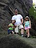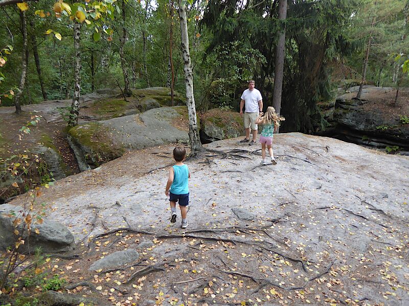 Weiter ging es in das Elbsandsteingebirge, genauer zum Felsenlabyrinth. Wir waren mit Uta und Familie verabredet. Leider machte es uns das Land Sachsen nicht sonderlich leicht und schickte uns von einer Umleitung in die nächste Baustelle und umgedreht. Aber irgendwann schafften wir es dann doch, mit fast 45 min Verspätung zur ursprünglichen Ankunftszeit, und hatten einen vergnüglichen Nachmittag mit der Familie Leimert. Wir sprangen, kletterten und krochen vergnügt durchs Felsenlabyrinth und alle hatten großen Spaß dabei. Viel zu schnell verging die Zeit und wir quatschten noch über Gott und die Welt. Während eines spontanen Regenschauers verzogen sich die Kinder ins Wohnmobil und die Erwachsene setzen ihre Gespräche im Bus fort.